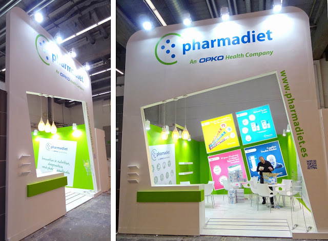 En una fira on la majoria d'empreses exposen amb els colors i formes sobries, hem volgut crear, per al nostre client Pharmadiet, un espai fresc i dinàmic. Que es ditingeixi dels seus veïns pels colors vius i el moviment de des formes inclinades.